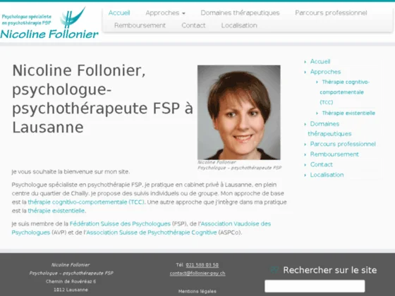 Cabinet de Nicoline Follonier, psychothérapeute à Lausanne (Suisse). Diplômée en psychologie de l'UNIL (Université de Lausanne), madame Follonier est au bénéfice du titre de psychothérapeute FSP, une formation postgrade de plusieurs années. Son approche de prédilection est la thérapie cognitivo-comportementale.