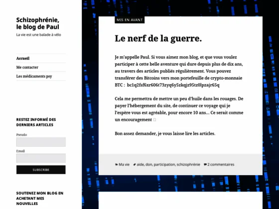 Je m’appelle Paul et je suis schizophrène depuis de nombreuses années. J’ai créé un blog que je mets à jour régulièrement. Je parle des souffrances que ressent une personne atteint par cette maladie. Je suis très limité dans mes déplacements, j’ai des angoisses quand je sors de chez moi. Avoir un blog c’est une façon de rester en contact avec les autres. Il y a de nombreux articles qui abordent tous les domaines ce cette maladie, la peur de la foule, de quitter mon appartement, d’avoir une vie sociale… De plus chaque lecteur peut répondre et parler de sa propre expérience, ce site est ouvert à toutes et tous, malade ou non. C’est une manière aussi de voir autrement cette maladie. La plupart des schizophrènes ne sont pas dangereux alors que les médias en font des monstres. Venez sur mon blog et découvrez la réalité de cette maladie.
