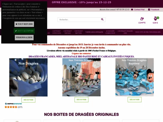 Accueil E-commerce Alimentation Confiserie Ambiance Dragées Ambiance Dragées Visiter le site : https://www.ambiancedragees.fr/index.cfm Ajouté le 27/02/2016 · Niveau 0 · 12 vues Sur le site internet ambiancedragees.fr, difficile de résister à la tentation : en effet, une large sélection de dragées toutes plus originales les unes que les autres attendent les amateurs en la matière. Pas de mariage, de baptême ou de communion dignes de ce nom sans ces sucreries affriolantes : amande, chocolat ou bien caramel beurre salé, tels sont les principales garnitures disponibles en ce domaine. Un choix à effectuer selon ses goûts et ses préférences, mais aussi en fonction des invités à la fête. Enfermés dans un contenant transparent, dans une boîte ou dans un ballotin, en tulle et en sachet, les dragées se présentent ainsi dans toute leur splendeur. Occasion spéciale pour un baptême : les célèbres personnages Minnie et Mickey, les Minions, Hello Kitty, Pirate, la Fée Clochette, ou bien Winnie l'Ourson égaient, à la demande, ces divers emballages festifs. Agrémentés de rubans et étiquettes personnalisées, tous font la joie des petits et des grands. Cube, éprouvette, boule, goutte et coeur sont également de la fête. Un rendez-vous à ne surtout pas manquer pour se faire plaisir, mais aussi faire honneur à un rituel exceptionnel. Enfants et adultes se réjouissent à la simple idée de déguster toutes ces merveilles colorées. Informations Dates Créé le 27/02/2016 Affichages 12 Niveau 0 Signaler un problème avec cette fiche