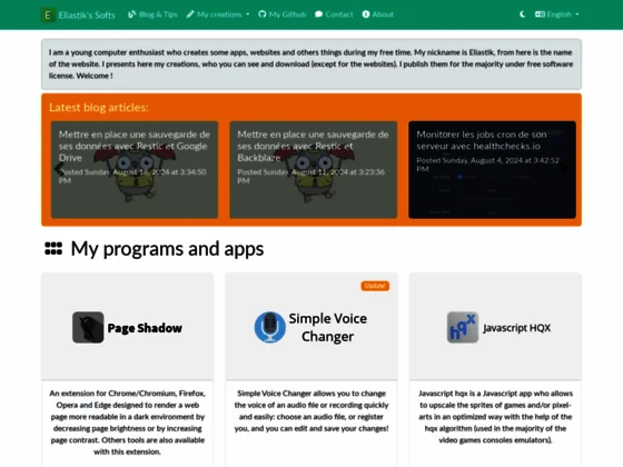 Eliastik's Softs est le site d'un jeune passionné d'informatique, qui crée ces diverses choses durant son temps libre. Ces créations sont mises à disposition pour tout internaute.