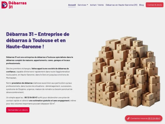 Le site Débarras 31 présente une entreprise spécialisée dans le débarras complet de logements et de locaux professionnels à Toulouse et dans toute la Haute-Garonne, avec des interventions étendues aux départements voisins. L’entreprise propose un service clé en main incluant l’évaluation du besoin, le tri des objets, l’enlèvement des encombrants, ainsi que le nettoyage des espaces après intervention. Elle intervient dans de nombreuses situations telles que les déménagements, les successions, les ventes immobilières, les sinistres ou encore les logements insalubres, en s’adaptant aux contraintes spécifiques de chaque client. Forte d’une solide expérience dans le domaine, Débarras 31 met en avant sa réactivité et sa capacité à intervenir rapidement, y compris en urgence, afin de répondre aux délais parfois courts imposés par certaines situations. L’entreprise s’adresse aussi bien aux particuliers qu’aux professionnels, en prenant en charge tous types de biens : maisons, appartements, caves, greniers, garages, commerces ou locaux d’entreprise. Elle assure des prestations complètes, allant du simple débarras partiel à la remise à vide totale d’un espace. L’un des points forts de l’entreprise réside dans son approche écoresponsable, avec un tri rigoureux des objets permettant de privilégier le recyclage, la revalorisation et le don lorsque cela est possible. Les objets récupérables peuvent ainsi être revendus ou redistribués, ce qui permet de limiter les déchets et, dans certains cas, de réduire le coût global de l’intervention, voire de proposer un débarras gratuit lorsque la valeur des biens compense les frais engagés. Le site met également en avant un fonctionnement transparent, avec des devis gratuits et détaillés établis après une analyse précise de la situation. L’entreprise s’engage à fournir des prestations réalisées avec sérieux, discrétion et efficacité, afin d’accompagner ses clients dans des moments souvent sensibles ou contraignants. Grâce à son ancrage local, à sa connaissance du terrain et à la qualité de ses interventions, Débarras 31 se positionne comme un partenaire de confiance pour tous les projets de débarras à Toulouse et dans sa région.