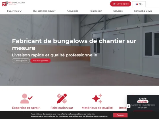 Le site MT Bungalow présente une entreprise spécialisée dans la conception, la fabrication et la commercialisation de bâtiments modulaires destinés aux professionnels et aux collectivités. Positionnée sur le marché du bungalow de chantier et des constructions préfabriquées, l’entreprise propose une large gamme de solutions modulaires adaptées à de nombreux usages : bureaux de chantier, bases vie, sanitaires, vestiaires, réfectoires, espaces de stockage ou encore guérites de sécurité. Grâce à une approche industrielle maîtrisée, MT Bungalow met en avant des constructions rapides à installer, évolutives et personnalisables, permettant de répondre efficacement aux besoins des secteurs du BTP, de l’industrie, de l’événementiel ou encore des collectivités locales. Le site détaille les différentes typologies de modules proposés, avec des configurations variées pouvant être assemblées pour créer des espaces sur mesure. Les bâtiments peuvent être équipés selon les besoins spécifiques des utilisateurs : isolation thermique renforcée, installations électriques, sanitaires complets, climatisation ou chauffage, aménagement intérieur optimisé. Cette modularité permet d’adapter chaque projet aux contraintes du terrain et aux exigences fonctionnelles, tout en garantissant un excellent rapport qualité/prix. MT Bungalow met également en avant la qualité de fabrication de ses structures, conçues à partir de matériaux robustes et durables, répondant aux normes en vigueur. L’entreprise insiste sur la fiabilité de ses solutions, leur facilité de transport et leur rapidité de mise en œuvre, constituant un avantage majeur pour les chantiers nécessitant des installations rapides et opérationnelles. Elle propose aussi des solutions en vente ou en location, offrant ainsi une flexibilité supplémentaire selon la durée et la nature des projets. Au-delà de l’aspect technique, le site valorise un accompagnement global du client, depuis l’étude du besoin jusqu’à la livraison et l’installation des modules. L’équipe MT Bungalow conseille ses clients dans le choix des configurations, des équipements et des options, afin de garantir une solution parfaitement adaptée à chaque projet. Cette approche sur mesure permet de répondre aussi bien à des besoins ponctuels qu’à des installations plus pérennes. Enfin, MT Bungalow se distingue par sa capacité à proposer des solutions modulaires modernes, fonctionnelles et conformes aux exigences actuelles en matière de confort et de performance énergétique. Grâce à son expertise et à la diversité de son offre, l’entreprise s’impose comme un acteur de référence dans le domaine des constructions modulaires en France, capable d’accompagner efficacement les professionnels dans leurs projets d’aménagement temporaire ou durable.